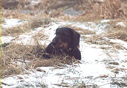 Dieser verschwindet wieder in den Strohballen. Jetzt brechen wir die Jagd ab, der Fuchs bleibt heute Sieger. 2. Jagdtag. Wir setzen am Sonntag die Beizjagd im Revier Steckelsdorf fort. Basra zeigt sich gesund, so daß wir sie schliefen lassen. Beim dritten Bau haben wir Glück. Basras dumpfer Laut lässt keinen Zweifel offen, sie hat Raubwild vor. Wir orten die Stelle und nehmen den Einschlag vor. Der Fuchs springt und Adlerweib Mädi (Das Weibchen ist wesentlich größer als der Terzel) lässt ihm nur 50m Flucht. Es geht ganz schnell, es ist ihr 8. Fuchs. Falknersheil. Stolz bin ich auf Basra, es ist ihre 10. erfolgreiche Arbeit am Naturbau (klick hier). Ein schöner Jagdtag geht zu Ende. 3. Jagdtag. Meine Basra - was für ein Hund! Wir werden am 16.12.02 zur Nachsuche gerufen. Unsere Nachsuchenspezialistin Jule muss ihrer Mutterrolle gerecht werden, so daß ich Basra unter den Arm klemme und etwas unsicher ins Revier fahre. Basra lässt sich gerne ablenken und arbeitet die Fährte dann nicht mehr sauber. Aber heute sollte sie mich eines Besseren belehren. Der Frischling wurde bei Mond beschossen, die Wundfährte stand nunmehr über 10 Stunden. Einen Anschuss fanden wir nicht, so daß ich Basra zur Quersuche schickte. Und siehe da, Basra saugt sich fest und läuft. Nach 300m finden wir ein Wundbett und den ersten Schweiß. Es geht in den Wald und wieder heraus über einen Acker wieder ins Holz. Basra liegt so gut im Riemen, dass ich ihr absolut vertraue. Nur einmal finden wir wenige Tropfen Schweiß. Nach weiteren 500m machen wir das kranke Stück aus dem Wundbett hoch. Es müdet auf, ich schnalle die Hündin - aber Basra wäre nicht Basra ... Den Frischling vor uns erblickt sie nicht, dafür die Rotte Sauen 50m dahinter. Mehr brauche ich nicht schreiben, der Spurlaut ist noch einige Minuten zu hören ... Zum Glück ist das Stück so krank, dass wir es nach wenigen Metern der Flucht erlösen können. Das Stück war schwer weidwund und wog 28kg. Es war eine echte Glanzleistung von Basra - jetzt entscheidet die Kommission für Naturarbeiten über die Vergabe des Leistungszeichen SchwhN. Ich bin richtig stolz auf meinen Ausreisser, der nach (nur) 20min neben mir steht und seine Beute zaust. | |