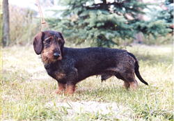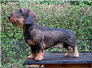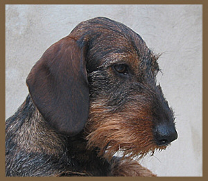 ![]() Bewertung vom 26.01.2003: Dunkelsaufarbener kräftiger Rüde, hervorragend harsche Behaarung, dunkles Auge, gut angesetzte Behänge, Scherengebiss, typvoller Rüdenkopf mit Bart und Augenbrauen, hoher Widerrist, gerader Rücken, gerade Vorderhand, gut gewinkelte parallel geführte Hinterhand |