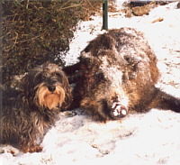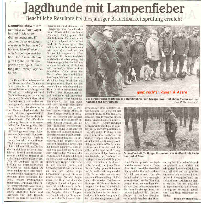 Azzra vom Bruchsee BP (Mecklenburg-Vorpommern) Azzra begleitet Rainer Sauer in Döbbertin bei der Jagd. Zusammen mit einem Laika bildet sie ein prima Team. Sie hat sich bei Nachsuchen auf Schwarzwild besonders bewährt. Die Hündin hat am 9.11.02 die Brauchbarkeitsprüfung für das Land Mecklenburg-Vorpommern erfolgreich abgelegt. 37 Hunde wurden an diesem Tag im Gehorsam, auf der Kunstfährte und beim Stöbern beurteilt. Klicken Sie hier zum Bericht über die Prüfung. |